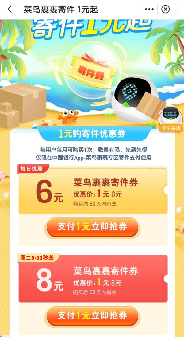 【领取路径】中国银行APP首页-搜索“菜鸟裹裹”-生活专区,进入页面可1元购买菜鸟裹裹6元快递寄件券,每周二上午9点可1元抢8元寄件券,购买后60天有效,每个用户每月仅可购买1次,有需要的值友可以关注一下~