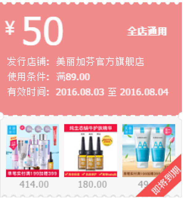 天猫美丽加芬旗舰店目前可以领取1张满89-50优惠券,券的面额还不错,而且全店通用噢!