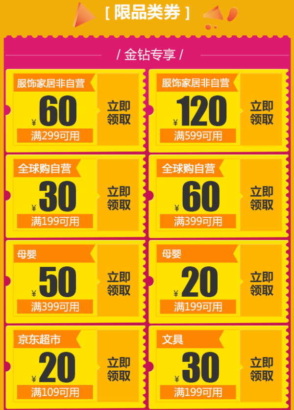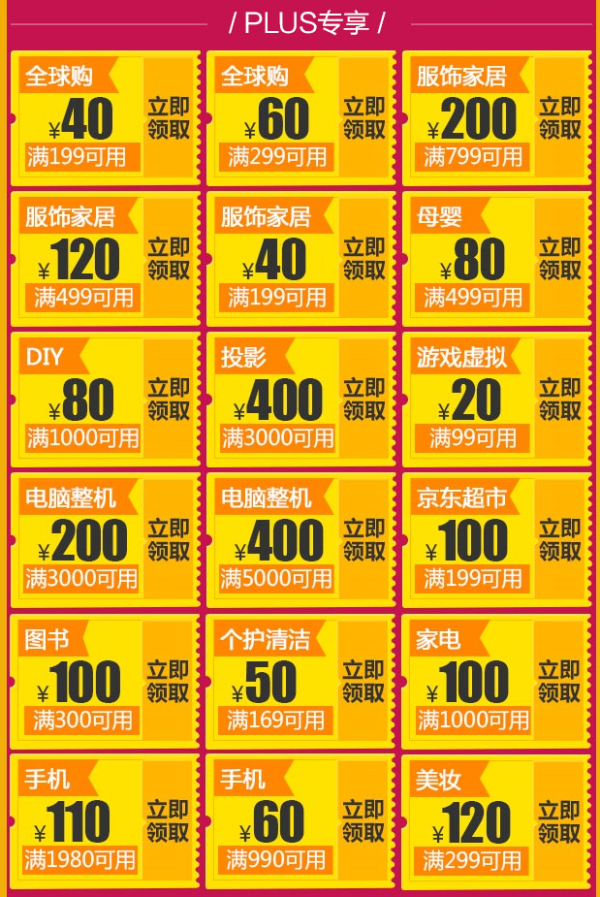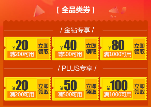 京东 金钻/PLUS专享 全品类券、限品类券、金融券汇总