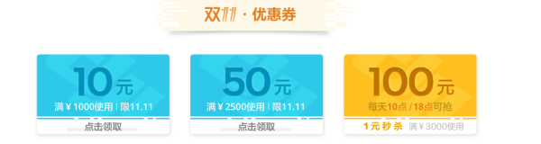 1、优惠额度:满1000-10元、满2500-50元优惠券、满3000-100元券(此券可在10点、18点和12-24点间的每个整点1元秒杀);